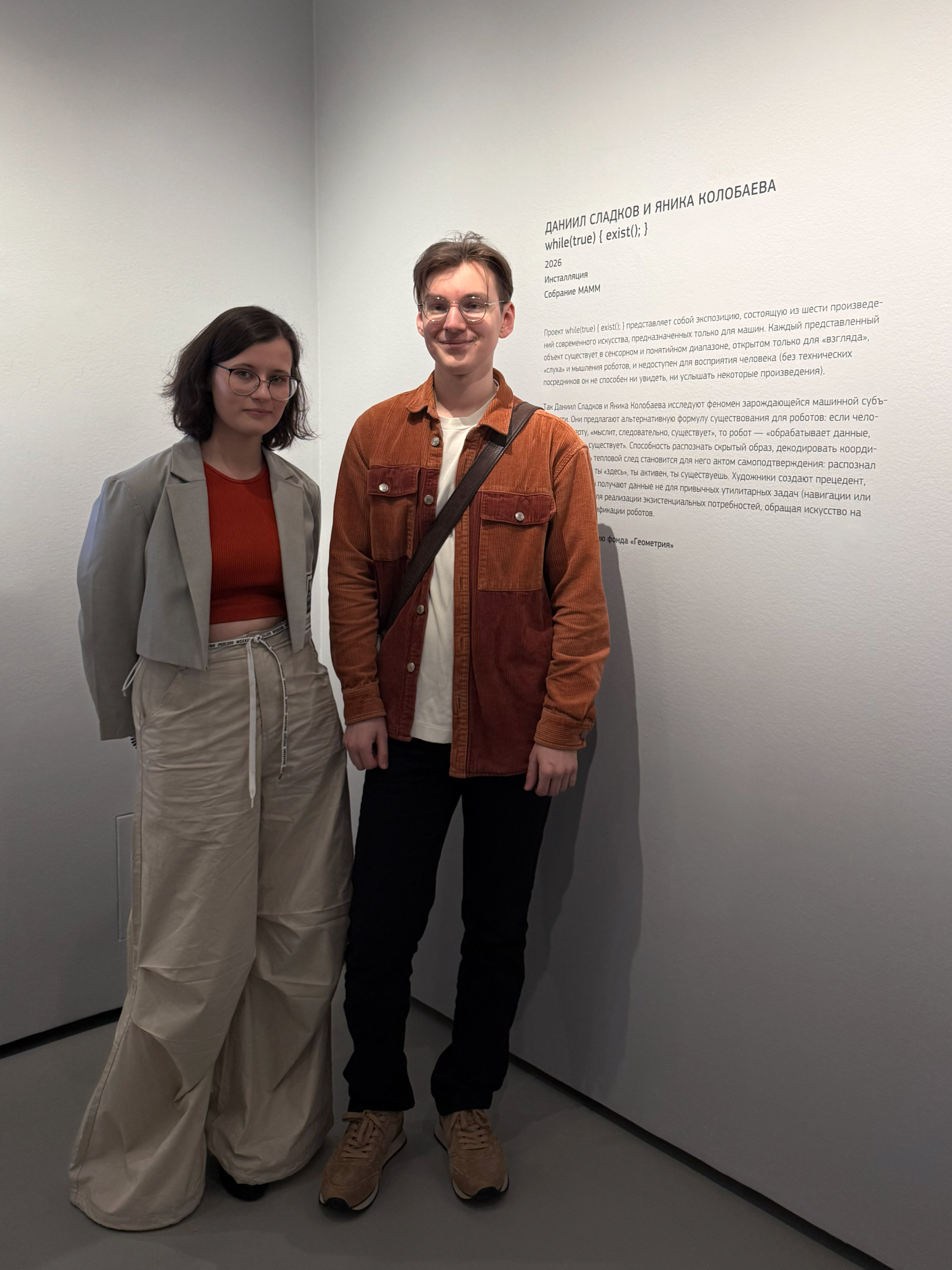 Выпускники магистерской программы «Технологическое искусство» Даниил Сладков и Яника Колобаева представили инсталляцию «While(true) { exist(); }» на II Международной биеннале «Искусство будущего». Проекты, начатые ещё в университете, вошли в постоянную коллекцию Мультимедиа Арт Музея.