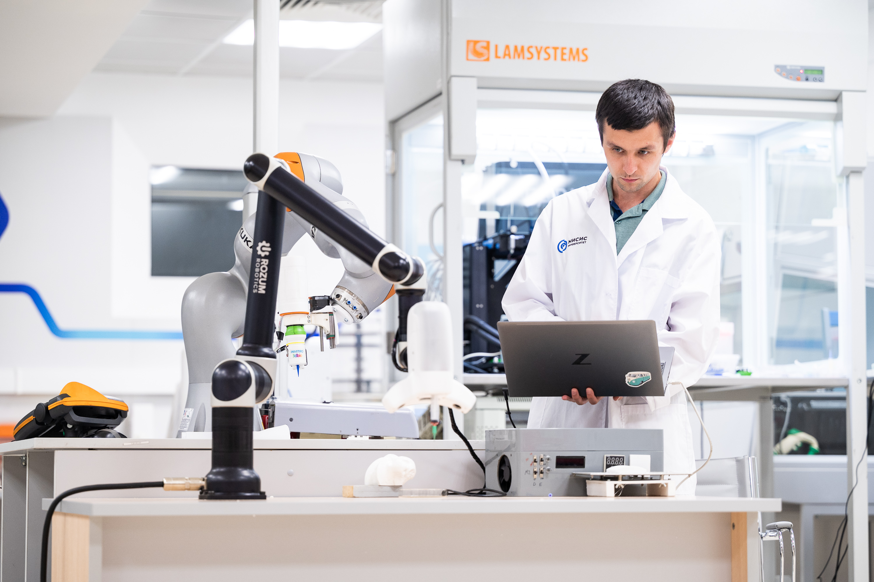 Роботическая система биопечати in situ непосредственно на тело пациента, разработанная учеными Университета МИСИС. В качестве биоматериала выступает гидрогель с добавлением клеток пациента, факторов роста и др. элементов.