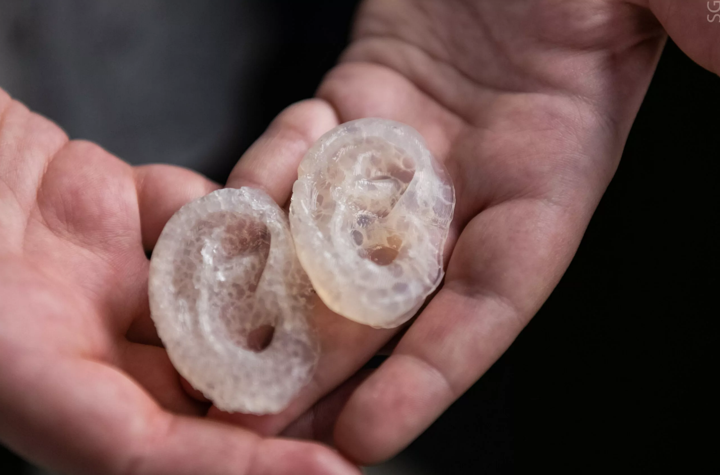 Протезы синтезируются из двух функциональных составляющих — пористого 3D-печатного каркаса и агарового гидрогеля в качестве наполнителя, сшитого феруловой кислотой. Гироидная структура полиуретанового каркаса способствует прорастанию сосудов, а интегрированные ребра жесткости обеспечивают сохранение формы под действием силы натяжения кожных лоскутов, что приближает имплантат к естественным ушным раковинам по биофизическим характеристикам. Использование аддитивных технологий также помогает решать задачу точного воссоздания формы и рельефа ушных раковин индивидуальных пациентов.