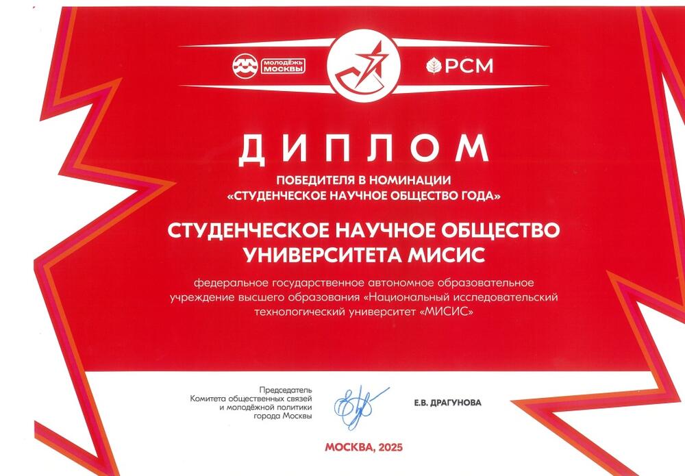 Российской национальной премии «Студент года — 2024» в номинации «Студенческое научное общество года» (20 декабря 2024 г.)